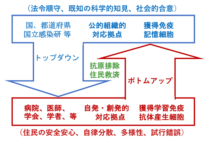 本稿では、連載第2回の[図5]社会的免疫進化システムを[図8]のように「トップダウンVSボトムアップ」の骨子を基本とする簡明なモデル化を行い、本図をベースにコロナ禍における種々の対応策に考察を加えよう。
