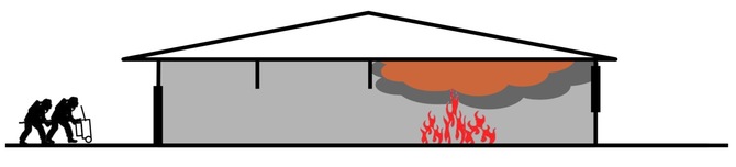 火災発生から先着隊到着時に行うことは、①排煙口が設置できればPPAを行う②排煙口が設置できなければ屋内閉鎖環境での消火活動になる③排煙口側にも警戒放水体制を取ることで万が一の延焼を防ぐーといったことが重要です。
