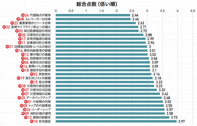 その結果、点数が最も低かったのは、本社施設が被災した場合の代替拠点の確保で平均点は2.44、次いで基本的な防災対策としてエレベーターの閉じ込め対策が2.46、重要業務についての代替リソース(経営資源)の確保が2.63などとなった。