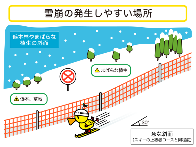 雪崩は、一般的に傾斜が30度以上の急な斜面や樹木が少ない斜面、笹や草など滑りやすい植生の斜面などで発生しやすいといわれています。