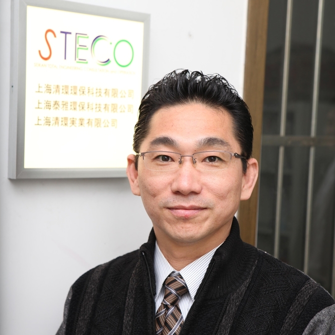 上海清環環保科技有限公司(STECO)/ 1965年7月 佐賀県生まれ。早稲田大学理工学部電気工学科卒。海外生活・事業経験27年(米国1.5年、韓国3年、アルゼンチン6年、中国16年)。2003年より中国事業に取り組み、2008年より上海清環環保科技有限公司(STECO)総経理就任。同済国際緑色産業創新センター(TIGIIC)運営幹事、日資企業節能環保推進研究会(JASPEE)運営幹事、上海佐賀県人会副会長、上海稲門会幹事長を務め、日本の優れた環境・省エネの世界標準化を目指すと同時に、海外進出済みの日系企業現地事業所の環境・省エネ対策サポートに取り組んでいる。机上の空論ではない実業経験を活かした実践的サポートが好評。
