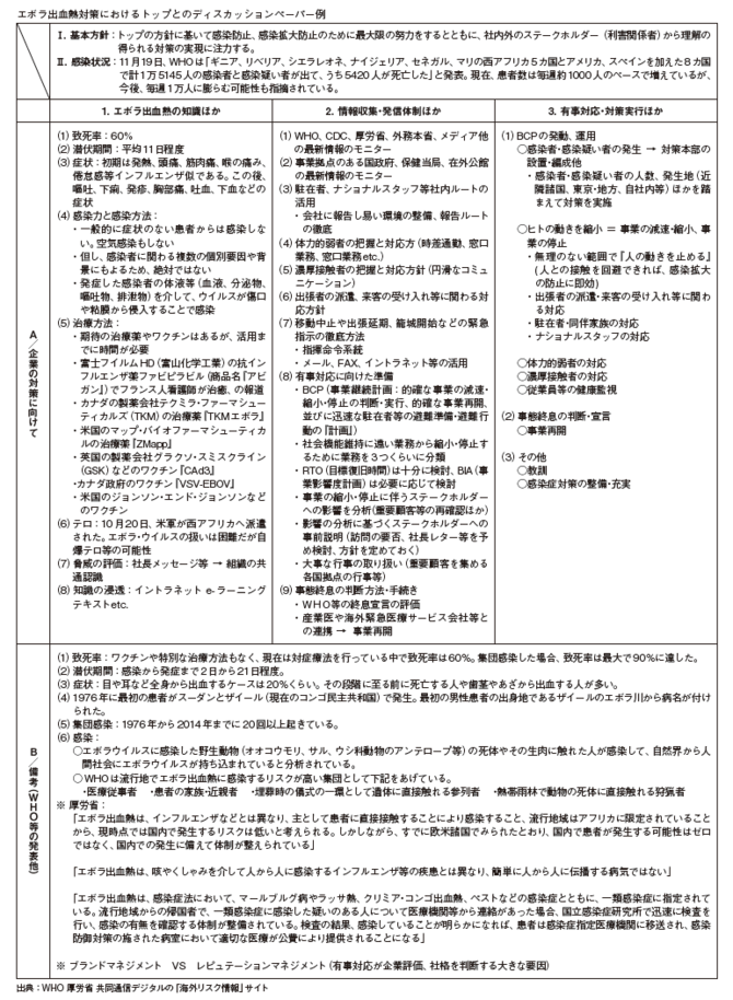 最後に、もし私が現在日立のリスク対策部長であったらと仮定して、社長とエボラ出血熱についてディスカッションするための資料を作成しましたので、皆様にご覧いただきます。こうした資料は、共同通信グループが提供する「海外リスク情報」(有料)からダウンロードすることができます。(http://kyodo-d.jp/btob/gathering/risk)