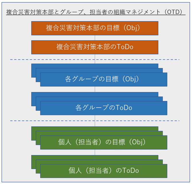 OTDは、まず複合災害対策本部の目標とToDoを定義することで、それが配下の各グループ、各担当者につながり、組織全体として一つの方向(Objectives)を目指す枠組みとして機能します。「対策本部全体」「グループ」「担当者」の3つの階層それぞれに目標と具体的行動が連動して定義されるため、組織全体のマネジメントが実施されるというわけです。