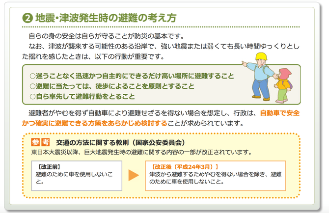 車での避難が渋滞を巻き起こし、死者を増やすということで、2012年3月以前は、「避難のため車を使用しないこと」となっていました。しかし現在は、交通量が少なく車に頼っている地域もあるし、何より車でなければ移動できない方もいるので「津波から避難するためやむを得ない場合を除き、避難のために車を使用しないこと。」と、車に関する避難については議論され、例外も認めるよう変化してきました。