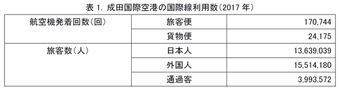 2017年1月から12月までの1年間、日本の主要な玄関口のひとつである成田国際空港では、旅客便と貨物便を合わせた国際線の航空機発着回数は約20万回、国際線に搭乗した旅客数は、日本人・外国人・トランジット客を合わせると3000万人を超えています。