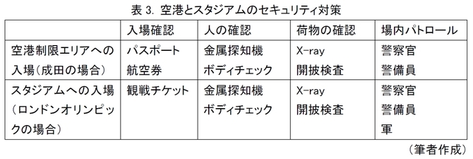 表3.のようにまとめると一目瞭然、ロンドンオリンピックのスタジアムセキュリティは、運用面を含めて、空港の保安検査とほぼ同じ要領で実施されました。空港での保安検査のようなチェックは、一般的な生活の中で受けることはまずありません。しかし、空港と同じセキュリティを実施していると聞けば、どのような検査を行っているのかほとんどの方がイメージできると思います。スタジアムでのそれを厳しいと感じるか、まだ甘いと捉えるかはそれぞれの判断ですが、検査を通過したクリーンエリアにいる人々は、全員が自分と同じレベルのセキュリティを受けてきたと私たちはわかっています。危ないものを持っている人はいない、と信じるからこそ、見ず知らずの何万人の人々と同じ空間にいても、その場所を安心して楽しむことができるのです。