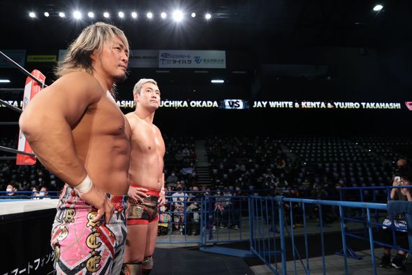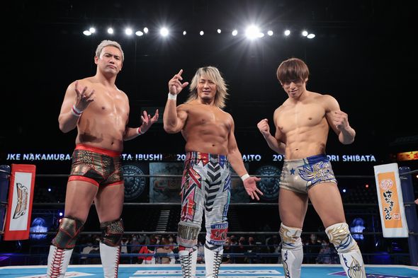 ヒールの選手ら3名がバックステージに退去すると、対戦相手のオカダ選手が「僕たちは残りましょう」と口を開く。