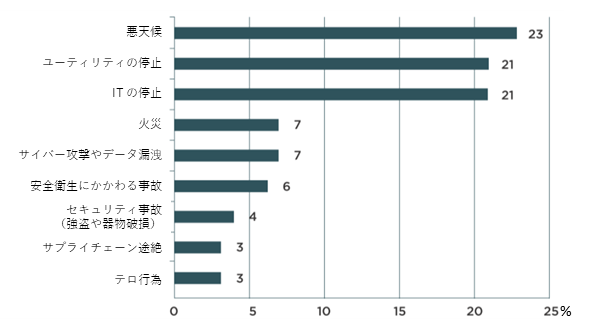 筆者の個人的な印象として、「テロ行為」によるものが 3%あることが目を引いた。おそらくテロ行為の発生(および発生の可能性)によって地域一帯で外出や移動が規制された影響などを広く含むものと思われる。日本ではあまり切迫感を感じられていないリスクかもしれないが、2020年東京オリンピック・パラリンピックの開催に向けてテロ行為が発生するリスクが高まると考えられる。日本企業においても自然災害だけでなく様々な可能性を考慮して、代替オフィスや在宅勤務などの選択肢を持っておくことを考えておくべきなのではないだろうか。