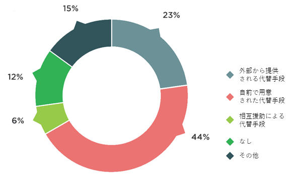 また図 2 は Experts に対して、どのような方法で仕事場の代替場所を準備しているかを尋ねた結果である。23%が例えばRegus Workplace Recovery社のような企業が提供しているバックアップオフィスサービスなどを利用しているのに対して、44%が自前で代替場所を手配すると回答している。