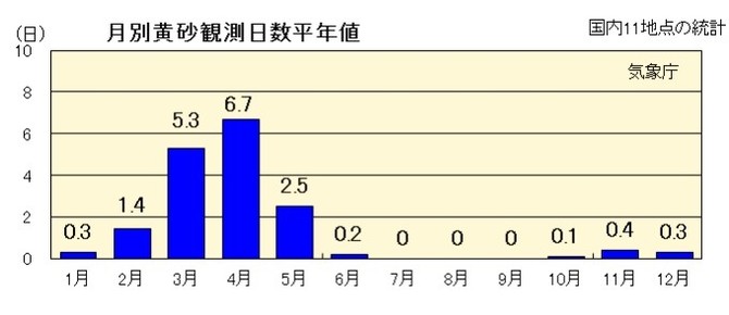 図2に、国内11地点の観測に基づく黄砂日数の月別平年値を示す。黄砂は春に多いことが歴然としており、最多月は4月である。