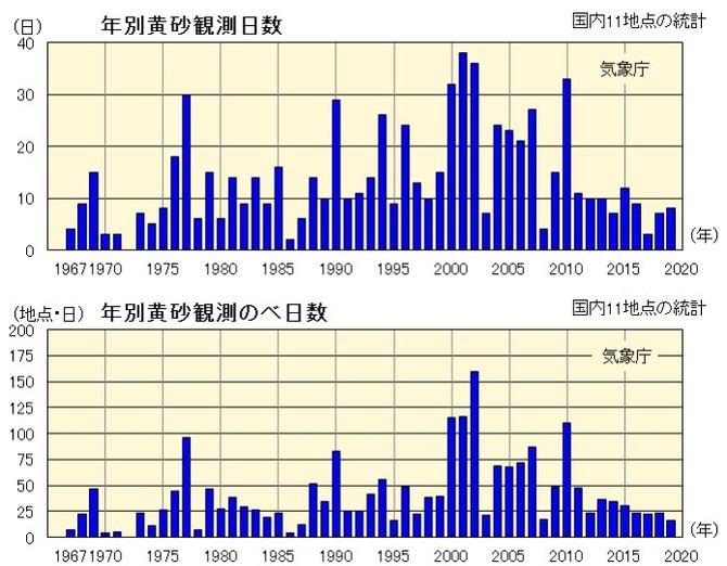 図1に、国内11地点における「黄砂観測日数」と「黄砂観測のべ日数」の経年変化を示す。2000年代は黄砂観測日数の多い年が目立ったが、2011年以降は、特に多い年は出現していないように見える。気象庁は、「黄砂観測日数に変化傾向は見られず、黄砂観測のべ日数は増加している。」としている。