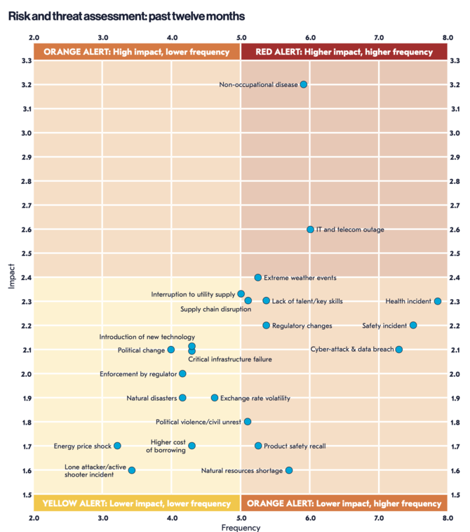 本報告書に関する調査は2020年12月に行われているため、当然ながら今回の報告書には新型コロナウイルスの影響が色濃く反映されている。図1は本調査の回答者が、過去12カ月間に影響を受けたリスクや脅威の評価結果で、縦軸に影響の大きさ(Impact)、横軸に発生頻度(Frequency)をとって評価結果を示したものである。文字が小さくて分かりにくいと思われるが、今回のパンデミックによって「Non-occupational disease」(業務上でない疾病)という項目が、図の上の方に突出して現れる結果となった。