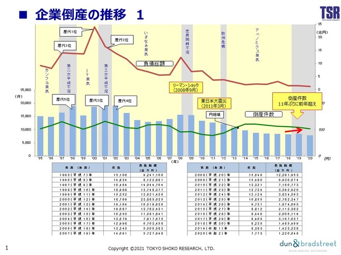 2008年9月のリーマン・ショック以降、倒産件数は増えることなく右肩下がりを続けてきました。「中小企業金融円滑化法」という時限立法が執行されたことにより、中小・零細企業の資金繰りはかなり緩和されたと言われています。円滑化法が失効し、アベノミクスのカンフル剤的な効果も薄れるなか、2020年1年間で倒産が急増するのではないかと思われました。ただ、コロナ禍による政府や金融機関による資金繰り支援策の効果で再び倒産件数が抑制される結果となりました。
