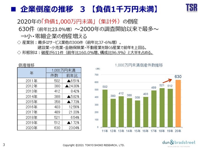 昨年1年間の倒産件数は7773件。30年ぶりに年間8000件を割り込みました。ただし、企業倒産の集計対象(負債1000万円以上)外の負債1000万円未満の倒産は、2000年以降で最多となっており、小・零細規模の倒産が着実に増えていることを浮き彫りにしました。