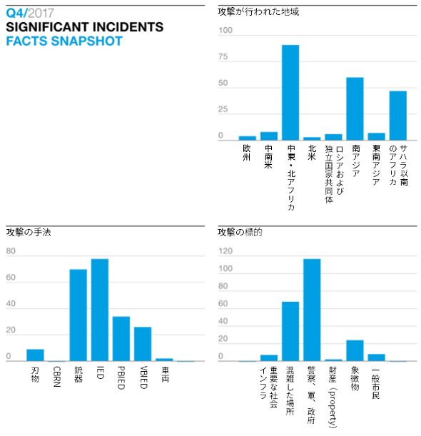 今回発行されたものは「1/2018」号となっており、2017 年第4四半期に発生したテロに関する情報を中心にまとめられている。図 1 は本報告書の最終ページに掲載されている図で、2017 年第4四半期に発生したテロの概況がまとめられている。テロ攻撃が行われた地域については中東、アフリカ、南アジアでその大部分を占めるという状況がはっきりわかる。