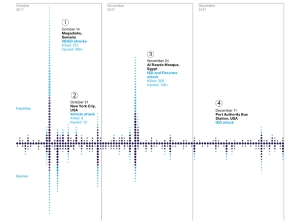 順序は前後するが、本稿のトップに掲載した図は、この報告書の表紙にも使われている図である。横軸は時間(第 4 四半期の3カ月分)を表しており、縦軸は上方向が死者数、下方向が負傷者数となっている。表紙では文字情報が省略されているが、本報告書の 6 ページでは文字情報とともに掲載されており、この中に含まれる次の4つの事件についてはより具体的な解説が掲載されている(番号はそれぞれ図中の番号に対応している)。