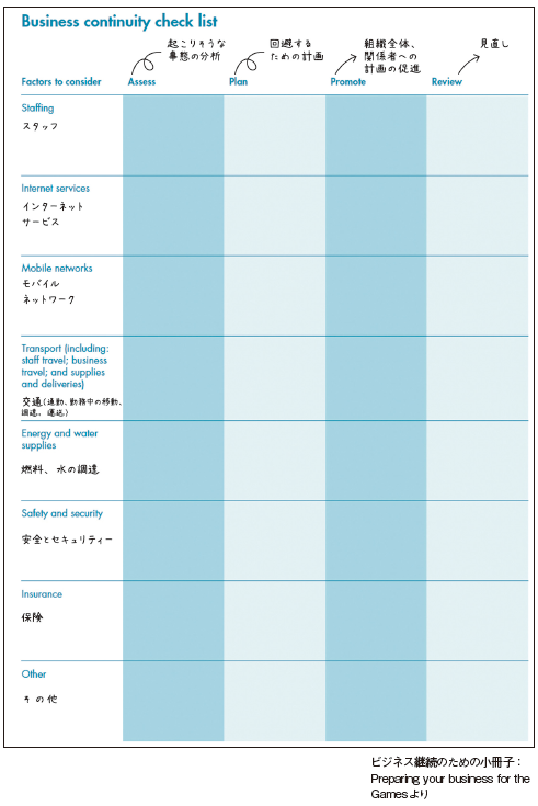 ロンドンでは、ロンドンオリンピック・パラリンピック組織委員が民間企業向けのビジネス継続のための小冊子を作成した。世界各国から大勢の観光客が市内に集まることで、交通の混雑や通信の遅延や途絶などが予想されたことから、事業継続計画(BCP)によって、リスクが回避できるように、あらかじめ備えることを呼びかけたのだ。