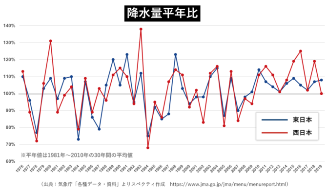 下図は、気象庁のデータベースから作成した1976年から2019年の降水量の平年比を示したグラフです。ここ10年ほどは平年を下回ることがなかったことが見受けられますが、20年前・30年前に比べて劇的に降水量が増えているということはないようです。