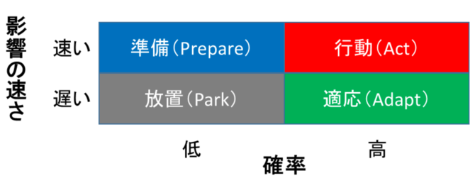 ここからの考え方は、リスクマネジメントプロセスと非常に似ていて(リスクマネジメントでは、企業に潜在するさまざまなリスクの全てに対応することは現実的ではないため、さまざまなリスクを「確率」と「影響度」で評価し、対策の優先順位をつけていく)、不確実性でも、その結果として取るべき対策に優先順位付けをしていくのです。