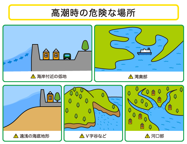 湾の長さが長く、湾の水深が浅いほど、湾や河口部の奥まで風などによって運ばれてきた海水が吹き寄せられて、海水面が大きく上昇します。また湾では、吹き寄せてきた海水がその反動で湾の反対側へと押し寄せることがあるので注意が必要です。