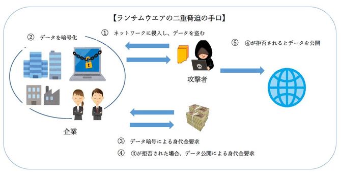 最近では、特定の企業や組織を狙ってランサムウェアに感染させ、データを盗んだ上、身代金を支払わなければデータを公開するなどと二重の脅迫を行う手口が確認されています。仮に身代金を支払っても、データが復旧され、データが公開されない保証はなく、さらに身代金を要求される恐れもあります。