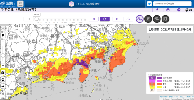 このたびの東海地方、関東地方の豪雨災害で被災された皆様に、心からのお見舞いを申し上げます。特に熱海市では土石流災害が発生し、多くの被害が出てしまいました。土中に雨の量が多い時に強い雨が降ったり、その雨が収まった後でも土砂災害が発生する可能性があります。まだ、この梅雨前線が停滞し雨が続きそうなので、救助活動をされている方々におかれましても、引き続き厳重にご注意くださいますようお願いいたします。