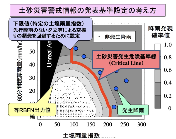 この図の中で、土砂災害が発生したことがない領域(黒の点が多い領域)と発生したことが目立つ領域(青の丸が混じる領域)の境目を結んでいるのが赤色の線です。この赤色の線はここでは「土砂災害発生危険基準線(Critical Line)」と名付けられています。資料によっては日本語の呼称が若干変化することがあるので今回の記事ではこの分かれ目を「土砂災害の分水嶺」と呼びたいと思います。