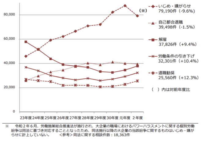 なお、大企業の職場におけるパワーハラスメントに関する相談件数は、1万8363件となっており、仮にこの相談件数と「いじめ・嫌がらせ」の相談件数を合算すると9万7553件となり、令和元年度における「いじめ・嫌がらせ」の相談件数(8万7570件)と比べて、1万件近く増加していることになります。