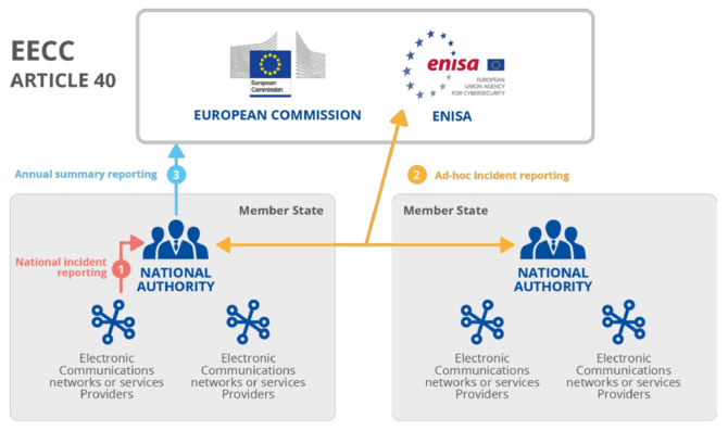 EECCとはEuropean Electronic Communications Codeの略で、具体的には2018年12月に制定されたEU司令2018/1972を指す(注3)。この第40条「Security of networks and services」で、本稿のトップに掲載した図のような報告の仕組みが定められている。
