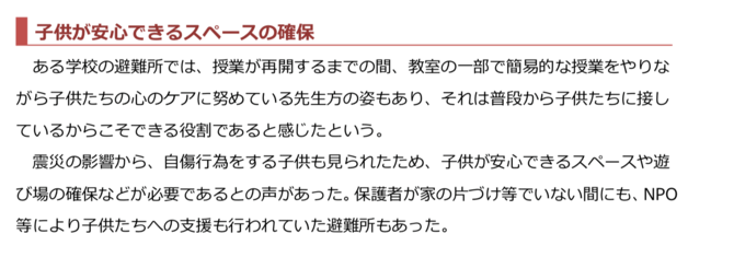ここでは、「震災の影響から、自傷行為をする子供も見られたため、子供が安心できるスペースや遊び場の確保などが必要であるとの声があがった」と記載があります。そう、ここにあるように、ストレスをためた子どもたちに自傷行為までみられたのです。