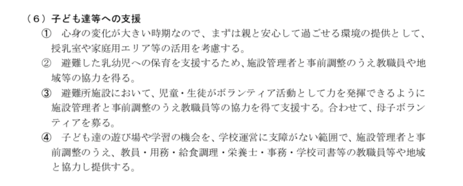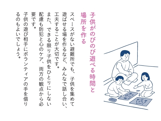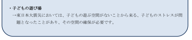 「東日本大震災においては、子どもの遊ぶ空間がないことから来る、子どものストレスが問題になったことがあり、その空間の確保が必要です」と、あります。わかりやすいですね!