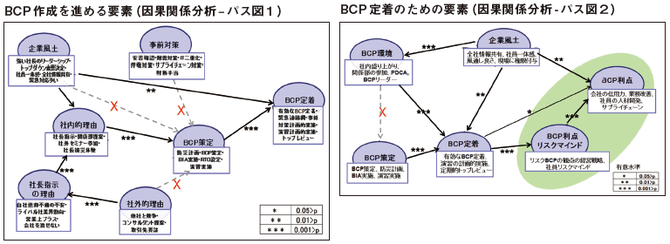 「BCP策定」の因果関係 をパス図1の結果からみると、BCP策定の原因は、「社内的な理由」(おもに社長の指示)によるものが大きい。「社外的な理由」(例:取引先の要請)は、 直接的な原因と認められなかった。「企業風土」も、BCP策定の直接の原因と認められず、防災活動など個別の「事前対策」の実施も、必ずしもBCP策定に つながっていない。