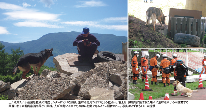 「災害救助犬とハンドラーの能力は人命に関わるのでRDTAでは試験を合格し、認定されて初めて災害救助活動に参加させる」と山田さんは試験の重要性を強調する。災害救助犬とハンドラーの育成は日本財団の助成を得て2013年に設立した、長野県にあるRDTA八ヶ岳国際救助犬育成センターで主に行っている。コンテナが設置され、大量の瓦礫やタイヤがうずたかく積まれている。