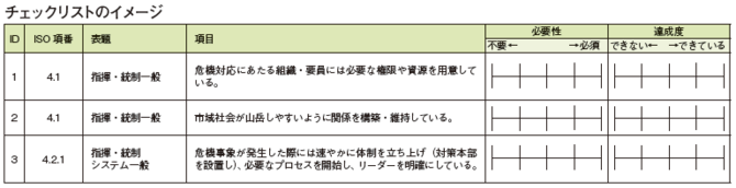 一般社団法人レジリエンス協会(会長:国立研究開発法人防災科学技術研究所 林春男理事長)は、危機対応に関する国際規格であるISO22320(社会セキュリティ−緊急事態管理−危機対応に関する要求事項)の簡易版自己診断チェックリストを公開している。規格の要求事項を精査・分析し、最低限必要と思われる33のチェックリストをわかりやすくまとめたもの。誰でも回答することができ、結果はレーダーチャートで表示され、自組織の危機管理体制などを再確認することができる。