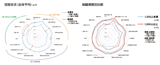 これまでに同協会が集計した約70の回答からは、いくつかの傾向が見えてきた。まず、全体的に必要性と達成度のギャップが大きいこと。つまり必要と感じていても多くが未達成である。特に「指揮・統制」の中での指揮統制プロセスや、「活動情報」における評価及びフィードバックの差が大きい。また、「人的要因」と「連携」関連(連携一般、連携プロセス、連携の目的)については、そもそも必要性も低いと思われている。「危機に対して既存スタッフだけで対応できる」、「自組織だけで対応ができる」と思われている傾向がうかがえる。