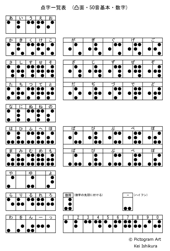 点字は、縦3点、横2点の6点の組み合わせで構成され、その単位を「マス」と言います。ピクトグラムアートのデザイナー石倉京氏に「点字一覧表(凸面)」の作成をお願いしましたのでご覧ください。