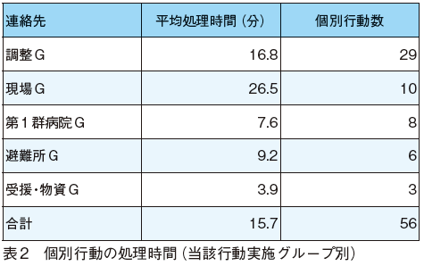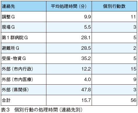 表3で外部機関への連絡を行った事例を見ると、北九州市内の機関と比べ、福岡県関係の機関への連絡に多くの時間を要したことがわかる。この連絡先は、福岡県医師会や福岡県DMAT事務局である。これらについては、連絡手続きへの習熟が不十分であった可能性が考えられる。