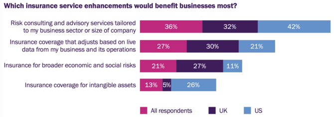 図1は、どのような保険サービスが充実することが最もビジネスに役立つかを尋ねた結果である。赤色が全回答者からの回答結果、紫色は英国、水色が米国からの回答結果を表わしている。