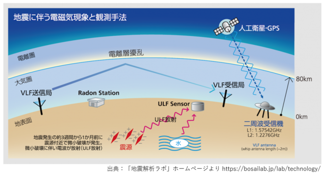 地震解析ラボによる地震予測は、国立研究開発法人防災科学技術研究所(防災科研)が運用している地震観測網、Hi-net(高感度地震観測網)およびF-net(広帯域地震観測網)の地震計のデータをベースにしており、そこに加えて、地震に伴う電磁波現象としての、①VLF/LF電離層擾乱(じょうらん)、②ULF電磁放射、③GPS(全地球測位システム)電離圏モニタリングを解析するというアプローチです。