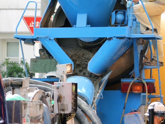 コンクリートというと、一般的には、茶色い大きな袋に入っている砂のようなもので、水と混ぜると硬くなるものというイメージを持っている人がいるかもしれない。正確には、これはセメントである。このセメントに砂利、水、混和材料などを混ぜたものが生コンクリートである。生コンクリートは混ぜた瞬間から化学反応を起こし、徐々に固さを増していく。