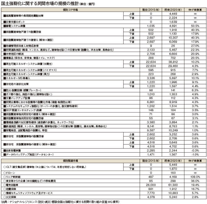「関連市場」とは、直接に国土強靱化を目的としているわけではないが、国土強靱化にも寄与すると思われる財やサービスに関する市場だ。ここには、災害時に住宅の電源として利用できる電気自動車の市場や、国土利用のリダンダンシー(インフラ等の多重化)の向上に寄与するリニア新幹線の市場なども含まれている。