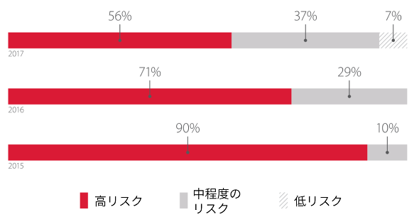 本報告書によると、平均して1アプリケーションあたり7つの脆弱性が見つかっており、これは前年より1つ増えている。しかしながらリスクの高い脆弱性を含むアプリケーションは減少しているという。図1は脆弱性が発見されたアプリケーションの割合が過去3年間でどのように変化したかを、そのリスクの度合ごとに表したものである。リスクの高い脆弱性が見つかったアプリケーションの割合が着実に減少している様子が分かる。
