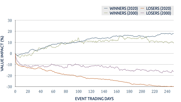 この報告書によれば、危機に直面した企業は翌年以降、ほとんど5%株価を下げています。また、2020年の調査では、危機に直面した後であるにもかかわらず株価を上げた企業は、危機発生後1年の間に市場期待値より20%上回ったという結果が出ています。逆に株価を下げた企業は、30%下回りました。つまり、企業の危機対応の出来・不出来がその後の企業価値(株価)の明暗をはっきりと分けていることが示唆される結果となりました。