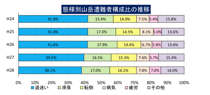 2000名だなんて、報道されている以上に、遭難は発生しているということですね。そして、遭難事故のうち、最も多いもの、それが「道迷い遭難」なのです。遭難と聞くと、気象条件の急激な変化とか、滑落とか、軽装備で登ったからという印象が強いかもしれません。しかし、統計をみていただければわかるように、単に「道に迷う」それこそが最大の遭難の原因なのです。