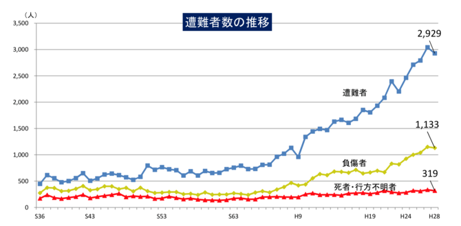 まずこちらをご覧ください。警察庁の統計によると、山岳遭難は毎年2000人以上で推移しています。