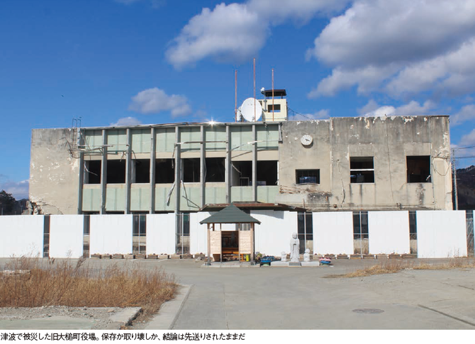 東日本大震災が発生した2011年3月11日14時46分18秒、大槌町にも強い揺れが発生した。その後の大津波により、沿岸部にあった市街地は壊滅的な打撃を受ける。2016年2月に町役場が公表している数字では死亡届受理数1233人。避難所などでの関連死を含めると1285人が震災で命を落としている。うち、いまだに420人の行方も分かっていない。町役場でも当時の加藤宏暉町長以下、職員約40人の命が失われ、役場としての機能を失った。津波に襲われた旧役場は現在でも残っているが、後世に残すか取り壊すか、問題は先送りされたままだ。さらに深刻だったのは、市街地の状況だ。岩手県公表資料によると、震災以前に大槌町に存在した事業者は793。そのうち98%にあたる777事業者が浸水区域にあったため、町の経済機能も壊滅したと言っていい。震災前に15000人以上いた住民のうち、現在、町の人口の公表数値は12000人余りだが、住民票による確認数字でもあり、実態は1万人を切っているとの推測もある。現在でも3000人強が仮設住宅での生活を余儀なくされている。