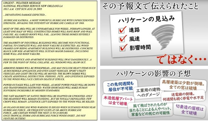 次の図の左側はハリケーン・カトリーナの際に地元気象当局から発表された予報の原文、右側はその要点を筆者がまとめたものです。予報文では、カトリーナによって家に住めなくなること、家屋や建物の構造や窓に大きな被害が出ること、電気や水が使えなくなること、人・ペット・家畜などが飛ばされた物に当たり死亡する可能性があることなどがダイレクトに伝えられました。
