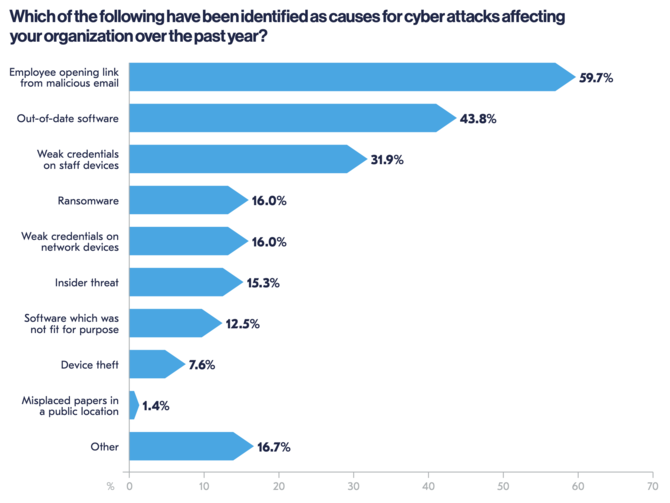 このような認識のもとに本文をナナメ読みした筆者が特に注目したデータを、以下にピックアップして紹介したい。まず図1は、過去1年の間にサイバー攻撃を受けた組織に対して、その原因を尋ねた結果である。複数回答が許されているので合計が100%とならないことにご注意いただきたい。