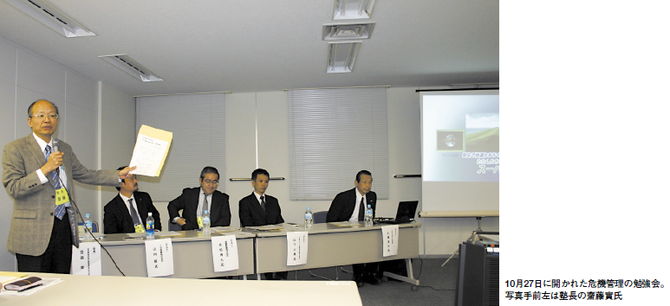 東京都や企業の危機管理担当者らでつくる「危機管理に関する勉強会」(塾長:東京都総合防災部情報統括課長齋藤實氏)は10月27日、「ゲリラ豪雨と洪水の危機―水災害の知識―」をテーマに開き、水災害に立ち向かうチーム水・日本「海抜ゼロメートル地帯防衛計画チーム」メンバーをゲストに招き、洪水による被害や、海抜ゼロメートル地帯が区の面積の7割を超える江戸川区における取り組みなどについて学んだ。