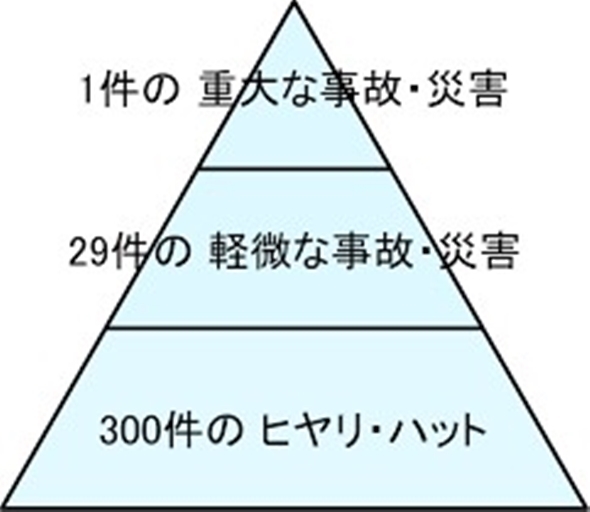 みなさんは「ハインリッヒの法則」をご存知ですか?これは、米国の損保会社の技師だったハーバート・ウィリアム・ハインリッヒ氏が労働災害の発生確率を調査し1929年に発表したものです。1つの大きな事故が起こる背景には、29の軽い事故が起きており、その背景には300ものヒヤリ・ハットの状況が存在するという法則です。